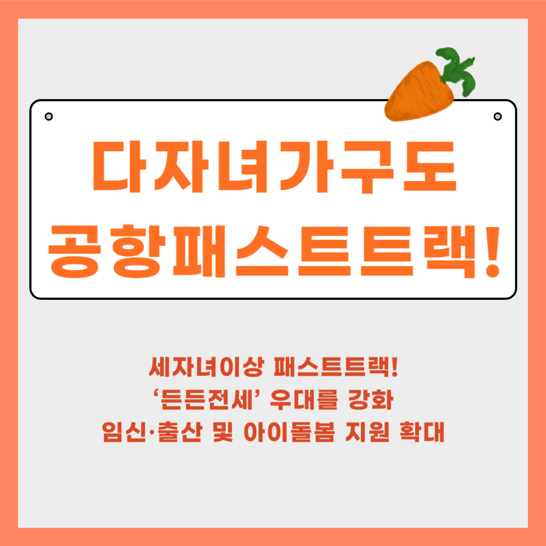 정부는 다자녀가구(세 자녀 이상)가 공항에서 빠르게 출국할 수 있도록 패스트트랙 서비스를 도입합니다. 기존에는 임산부, 장애인, 영유아 동반객 등 교통약자 및 사회적 기여자에게만 제공됐으나, 이번 정책을 통해 다자녀가구도 포함되었습니다.