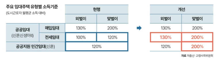 - 맞벌이 가구 소득 기준 120% → 200% 상향