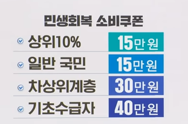 - 대다수 국민은 15만 원, 차상위 계층은 30만 원, 기초 수급자는 40만 원을 받게 됨.