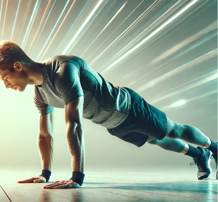 1. 손바닥을 바닥에 대고 팔을 뻗은 상태에서 플랭크 자세를 유지합니다.
