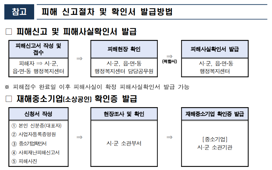신속한 신고와 재해피해사실확인서 발급이 가장 중요합니다.