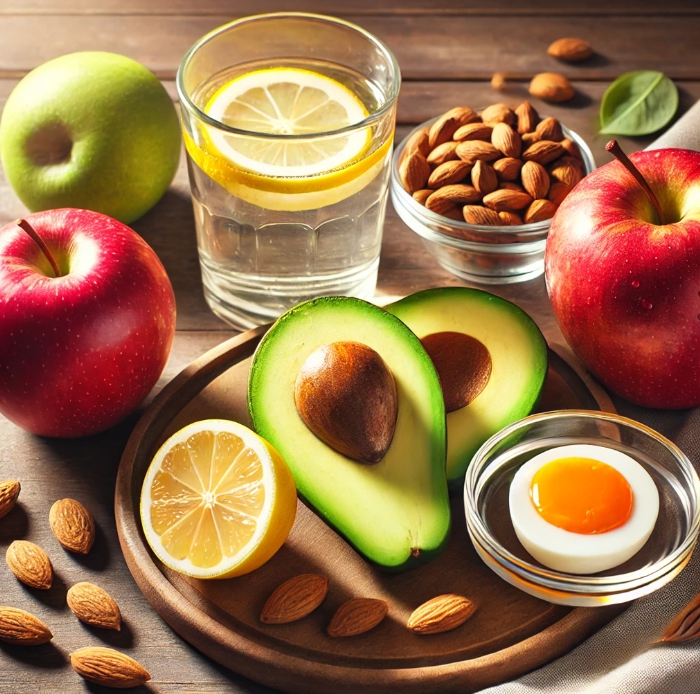 레몬 워터 → 사과 → 삶은 달걀 → 아보카도 → 견과류