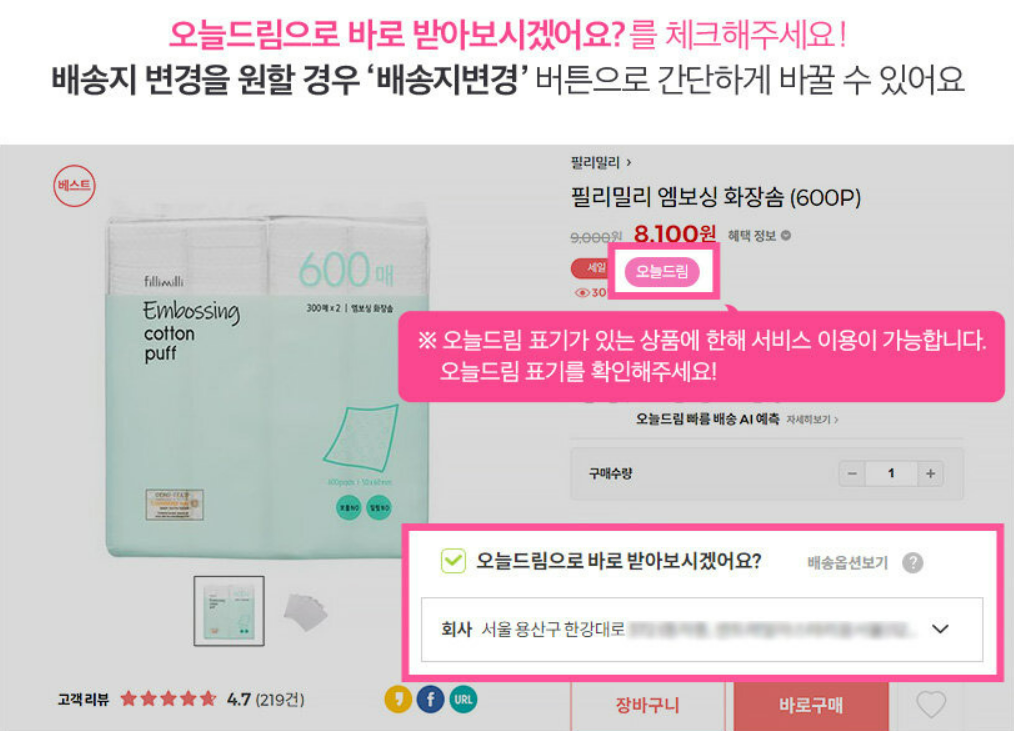 상품 상세 페이지에서 ‘오늘드림’ 아이콘이 있는지 확인 (아이콘이 없는 상품은 당일배송 불가)