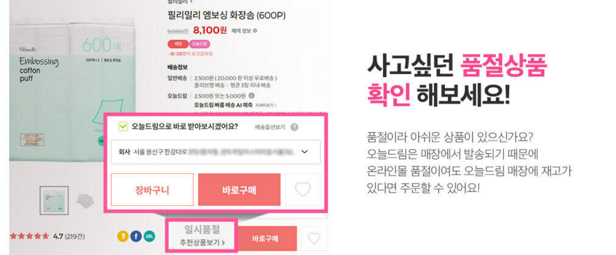 일부 지역에서는 오늘드림 서비스가 제공되지 않을 수 있으므로, 주문 시 확인이 필요합니다. - 일부 인기 제품은 재고 부족으로 주문이 어려울 수 있습니다.