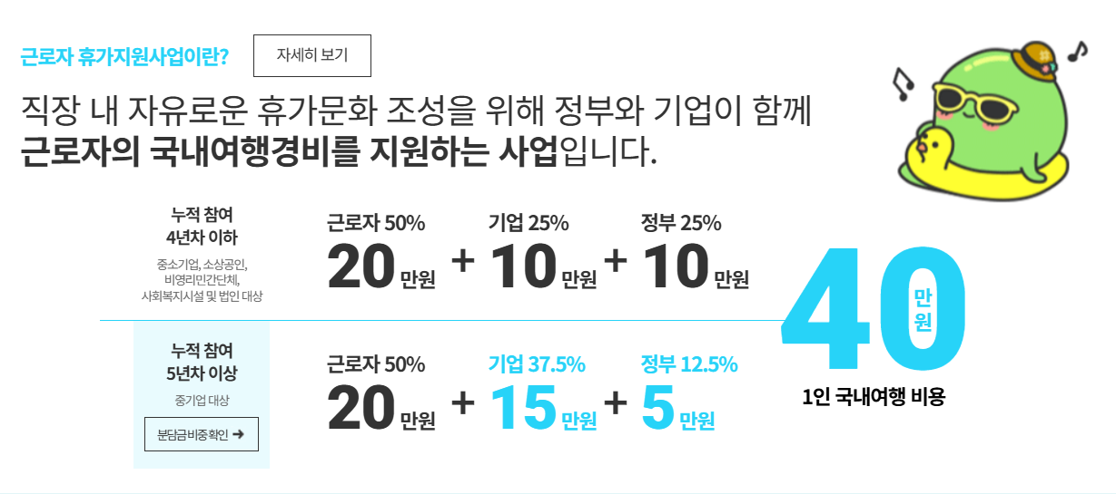 지원 내용 근로자 20만 원 + 기업 10만 원 + 정부 10만 원 = 총 40만 원 여행 경비